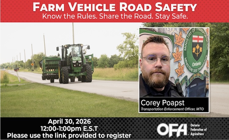 As the weather improves, planting season begins and farm vehicles will be increasingly sharing the roadways. Please join Corey Poapst, a transportation enforcement officer with the Ministry of Transportation Ontario, for a virtual session focused on helping everyone stay safe this spring—whether you’re driving farm equipment or commuting on rural roads.