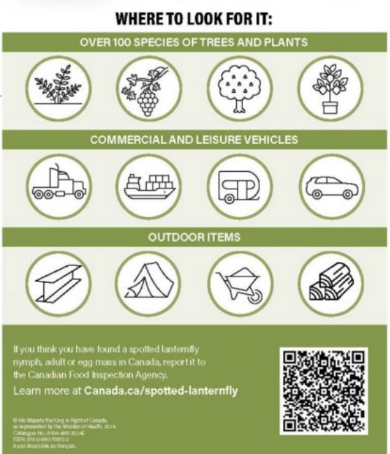 In an effort to prevent its introduction and spread into Canada, spotted lanternfly (Lycorma delicatula, Hemiptera: Fulgoridae) has been regulated by the Canadian Food Inspection Agency (CFIA) since 2018. No established populations are known to be present in Canada, but it poses a significant threat to the grape, tree fruit, wine and ornamental nursery industries.